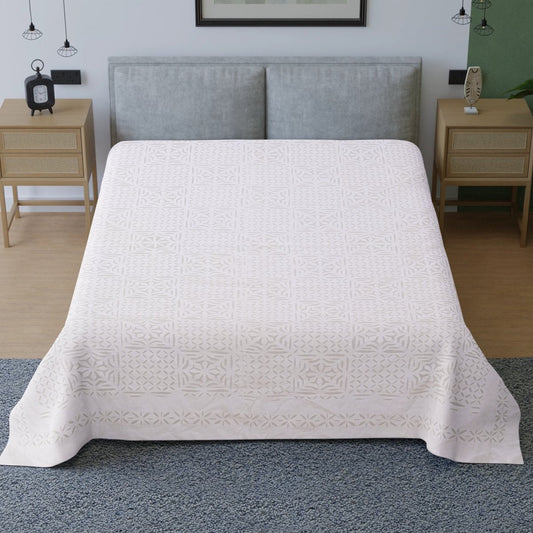 Applique Cutwork Cotton Double Bed Cover in White Summer Solace | Handmade in India
