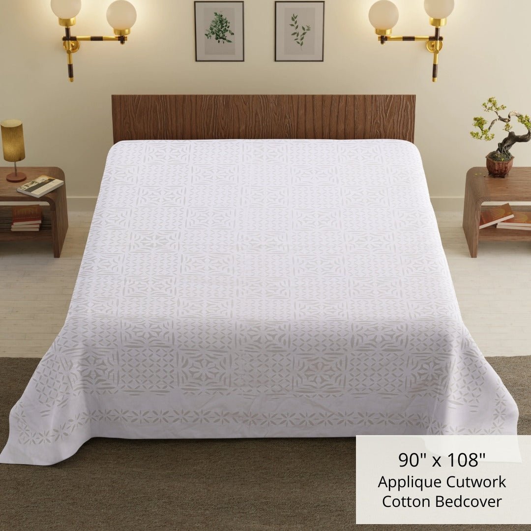 Applique Cutwork Cotton Double Bed Cover in White Summer Solace | Handmade in India
