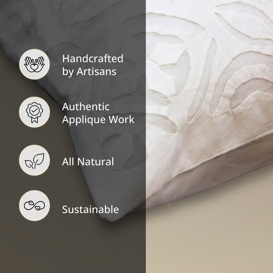 Soothing interiors begin with pieces like this exquisite applique cutwork cushion cover in off-white. This cotton cushion cover (16"" x 16"") is meticulously crafted using Gudri work, a special type of cutwork and embroidery technique.