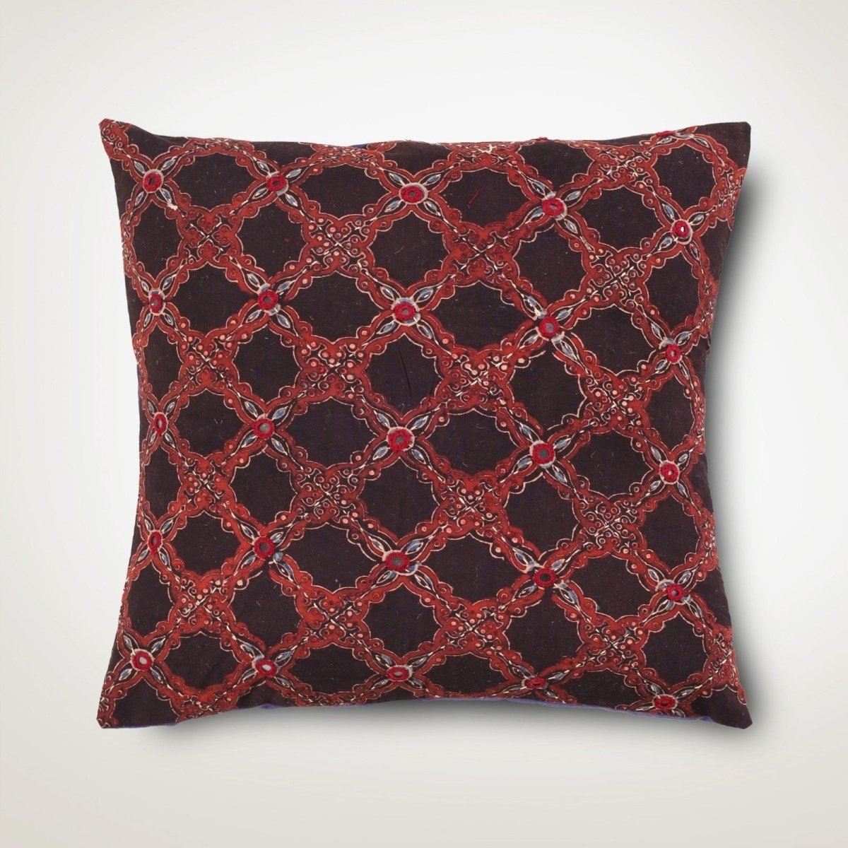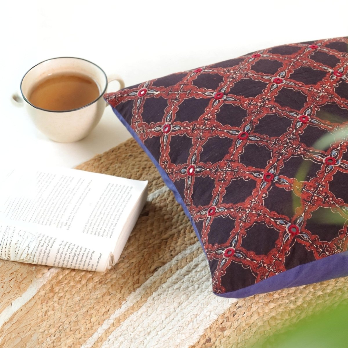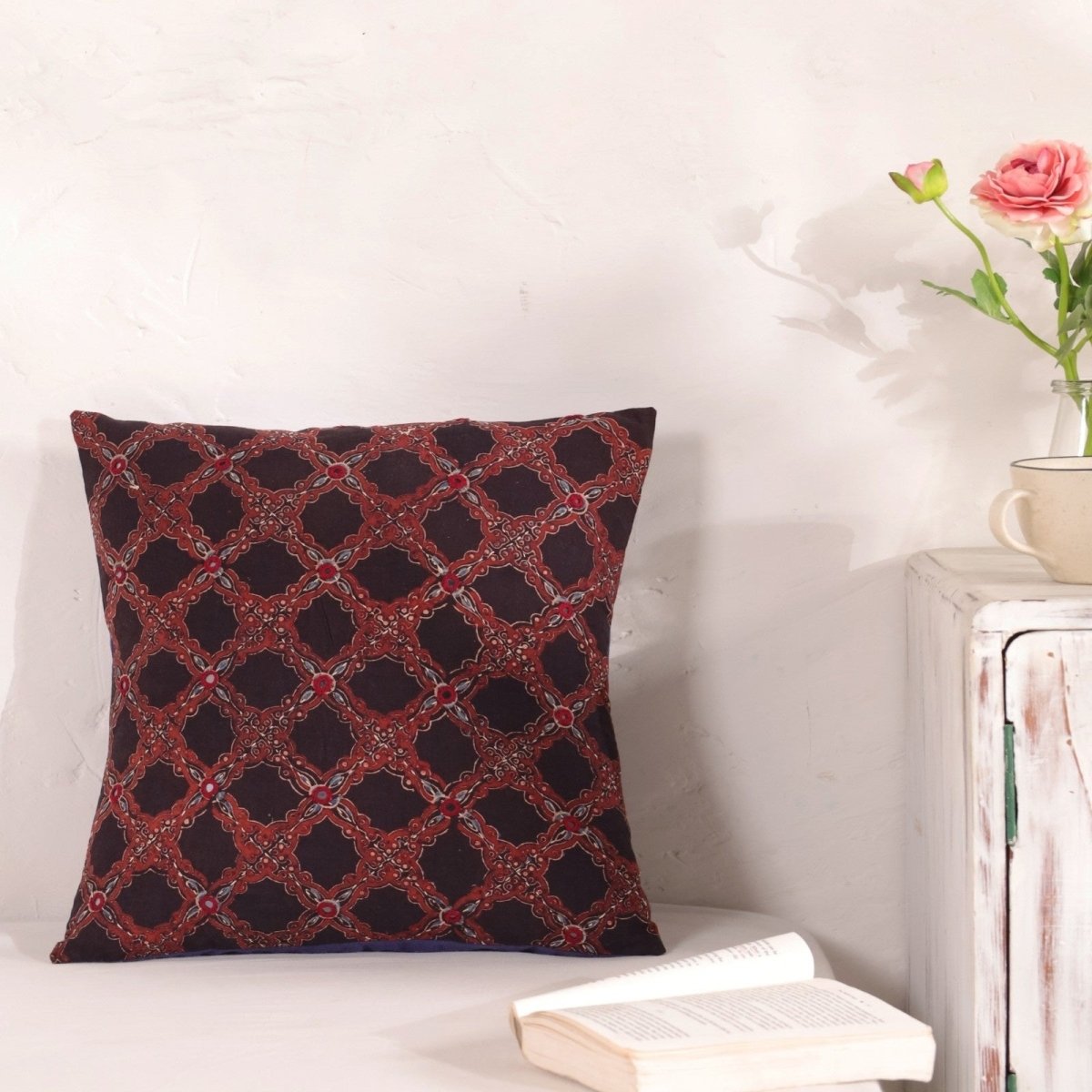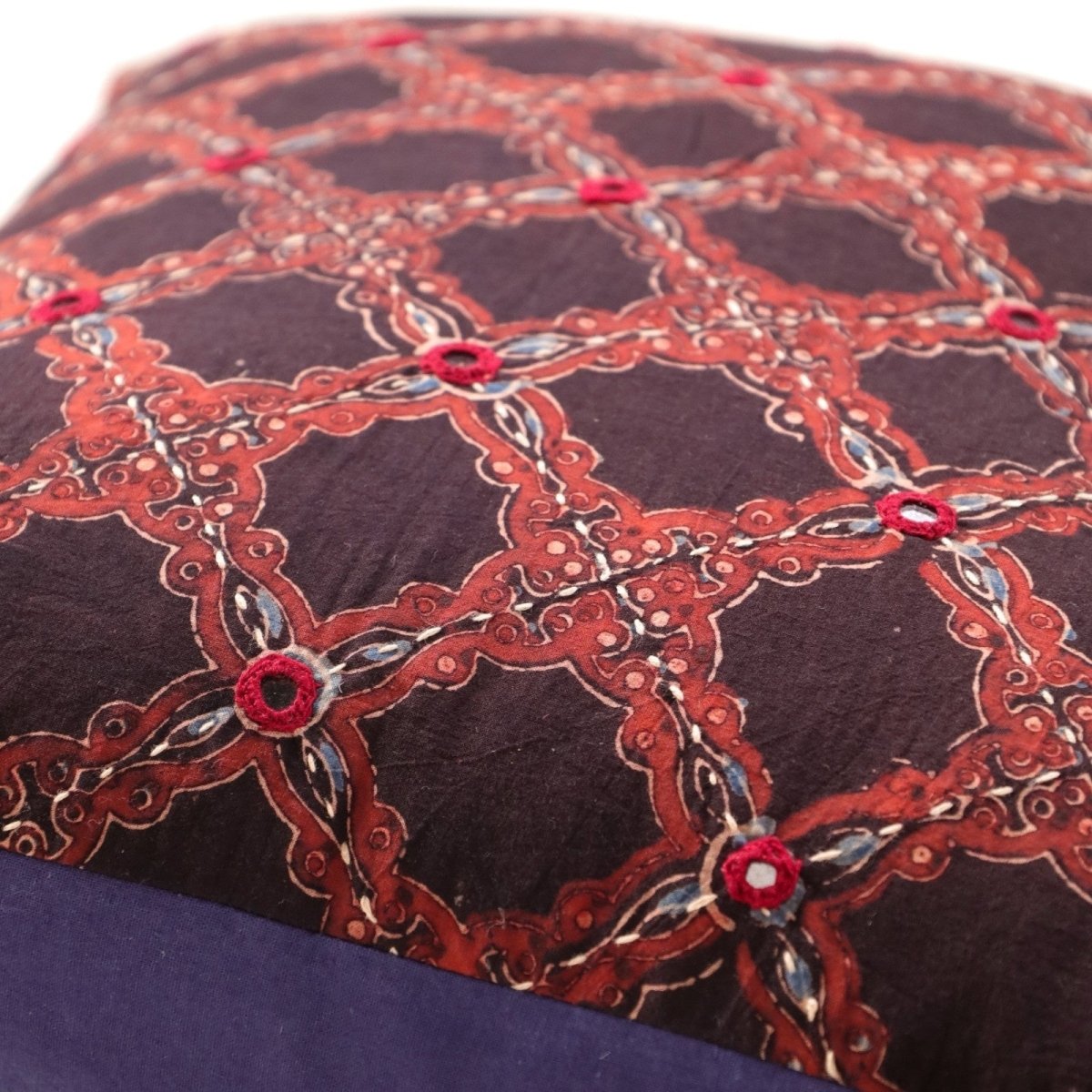 These cushion covers (16 x 16) are an amalgamation of two craft forms - Ajrakh hand block printing and hand embroidery. Rich earthy tones are juxtaposed with geometric hand embroidery and glistening mirrors.
