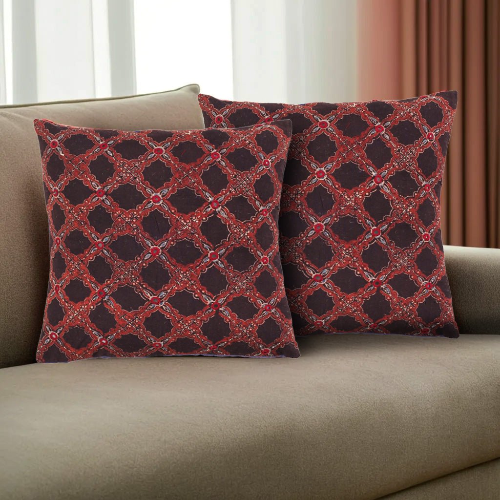 Cotton Cushion Covers Embroidered And Block Printed In Black And Red Set Of 1/2/4 | 16 x 16 | Handmade In India