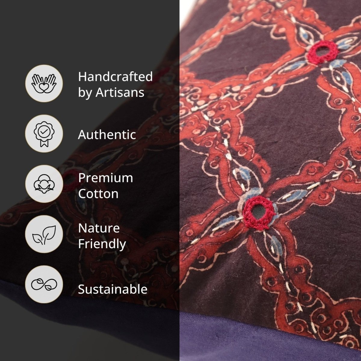 Available as a single piece or as a set of 2 and a set of 4, these premium handmade square cushion covers are handcrafted in pure cotton making them durable, comfortable, and skin friendly. They are also 100% colorfast and easy to maintain.