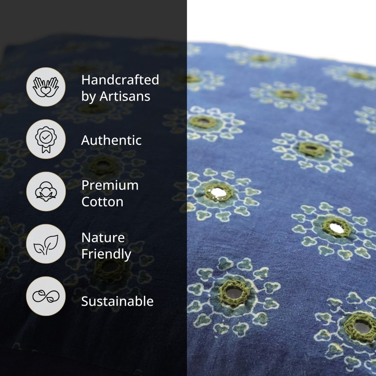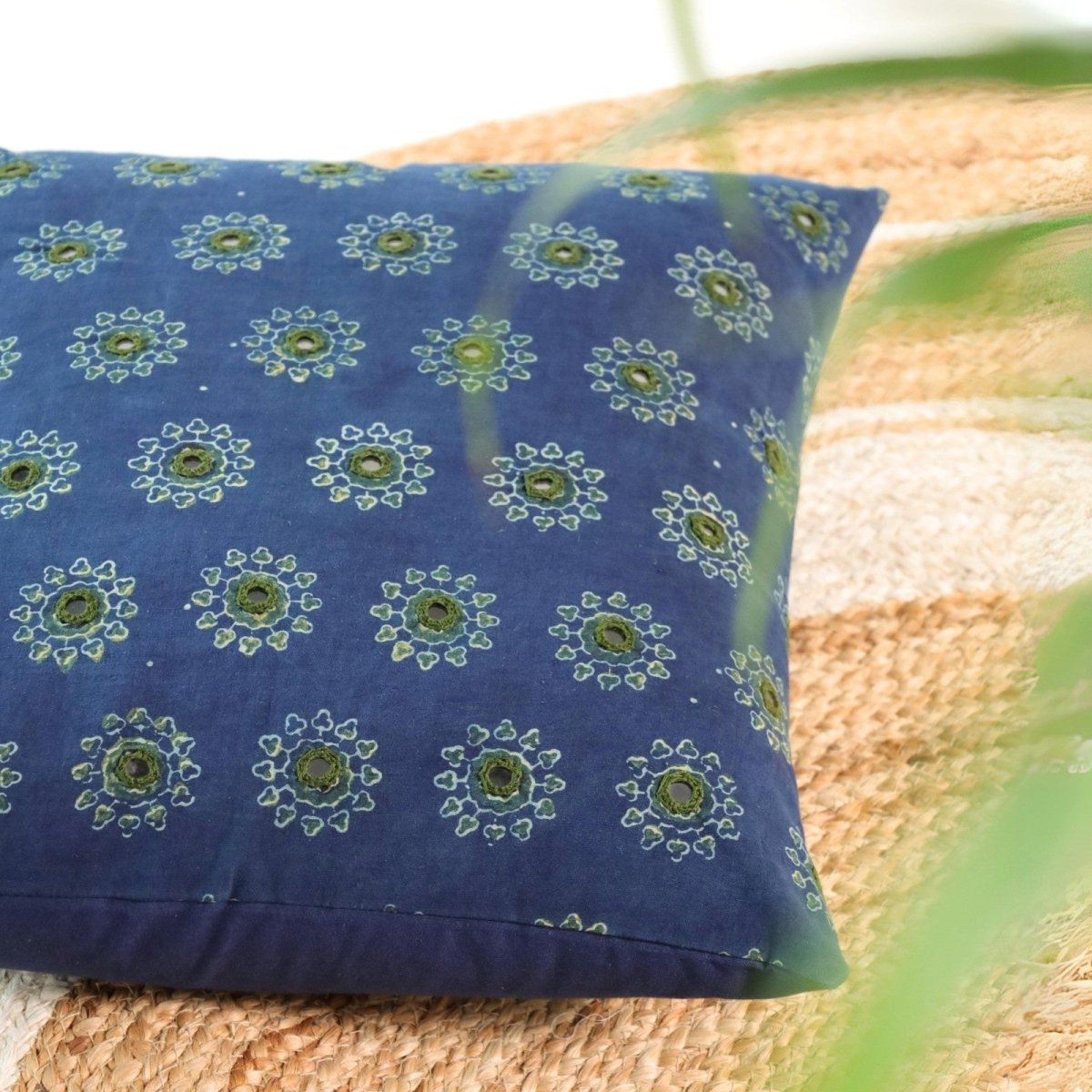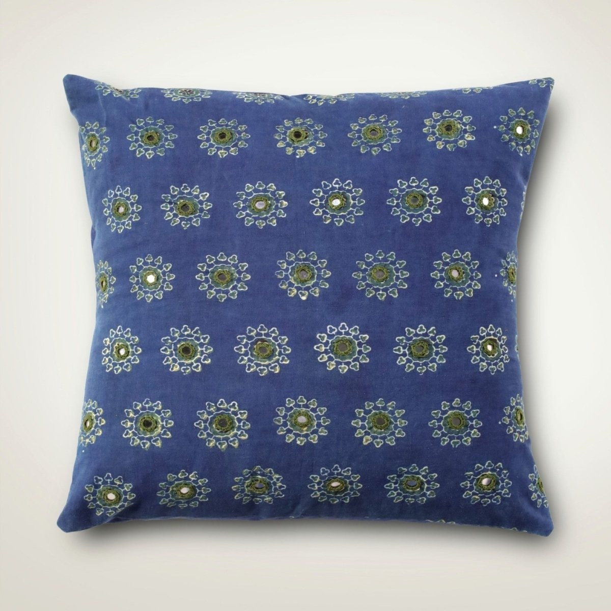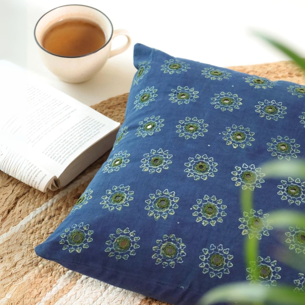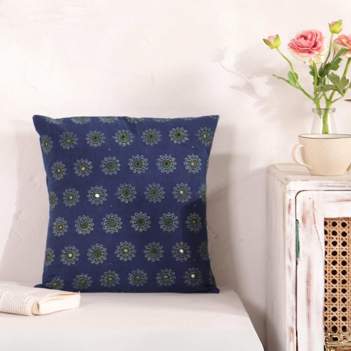 Indigo hues are juxtaposed with glistening hand embroidered mirrors making this cushion cover (16 x 16) the perfect way to add a dash of color and glimmer to your space.