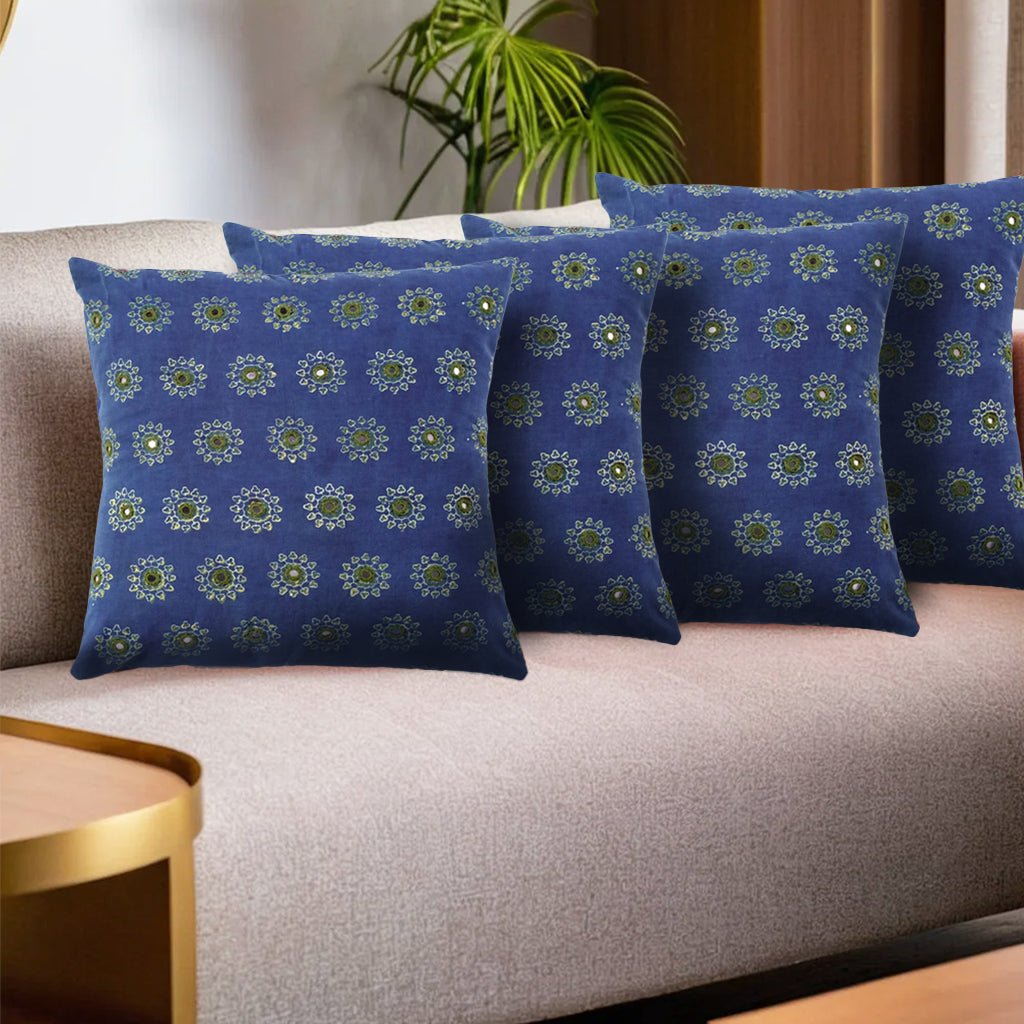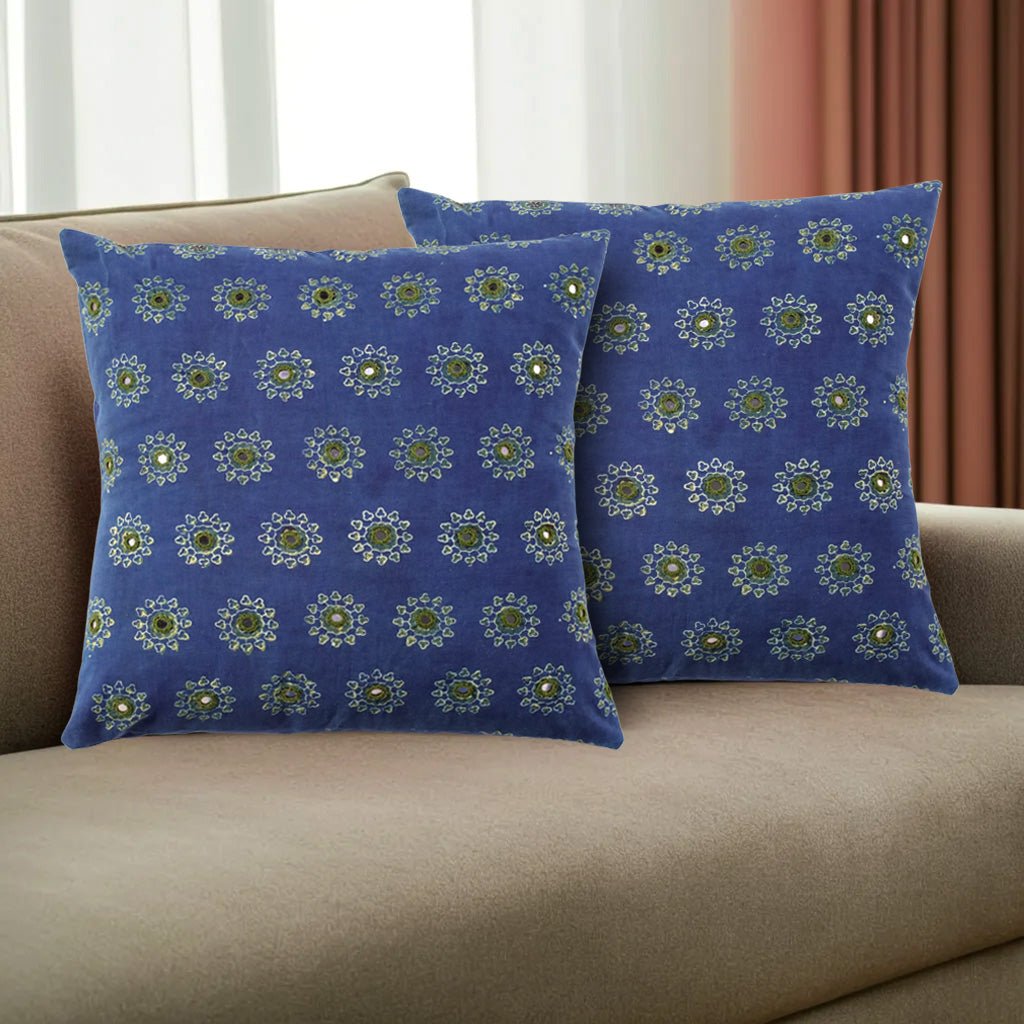 Cotton Cushion Covers Embroidered and Block Printed In Blue & Green Set Of 1/2/4 | 16 x 16 | Handmade In India