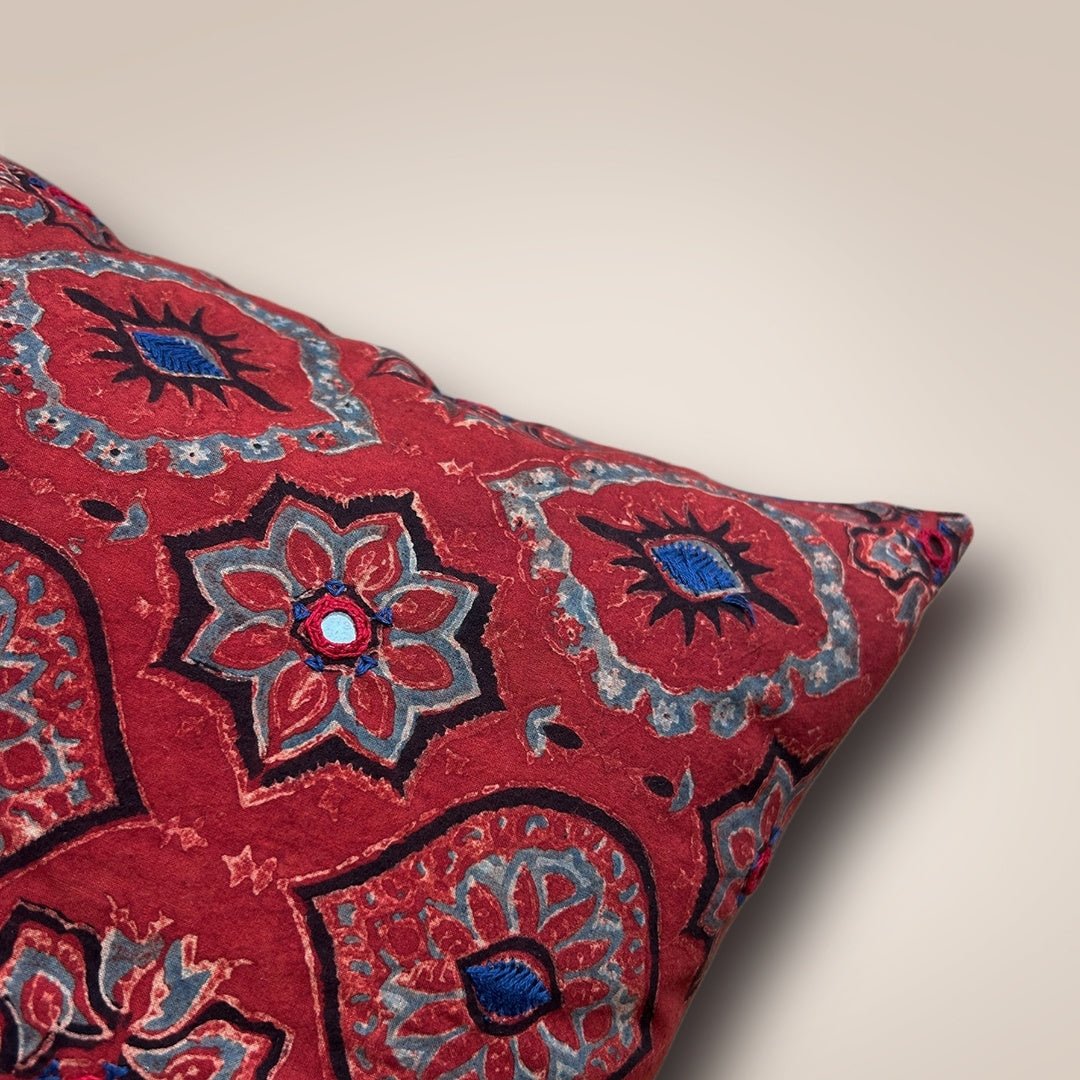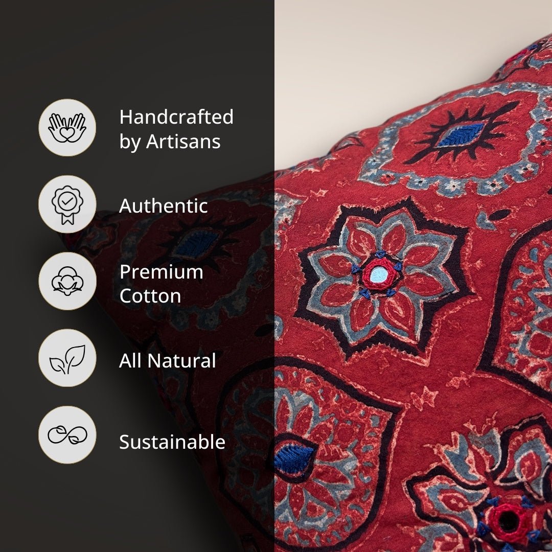 Rich brick red tones are juxtaposed with beautiful indigo hues highlighted with hand embroidery and glistening mirrors. Bring home this cushion cover (16 x 16) to add a dash of colour to your space.