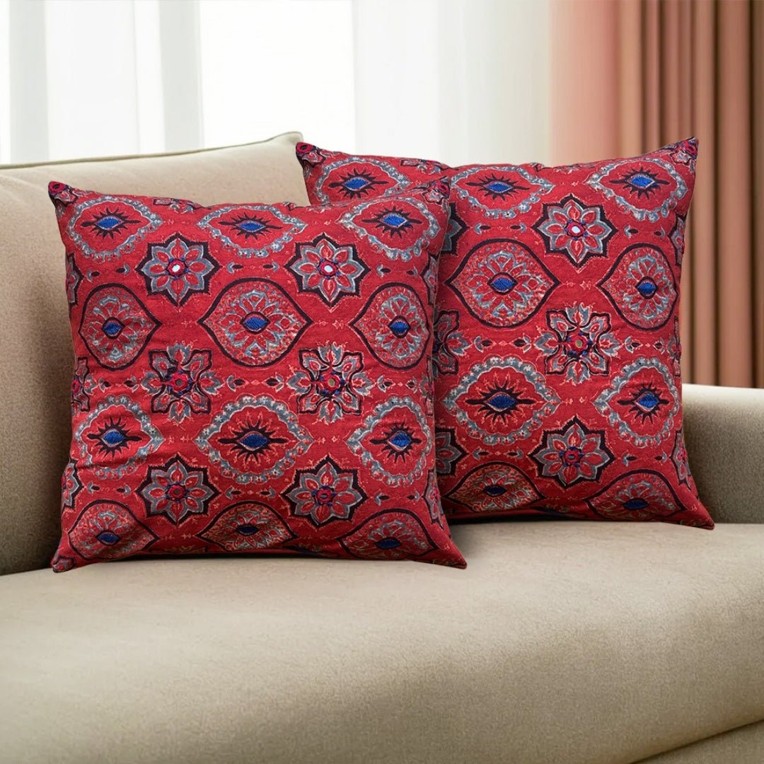 Cotton Embroidered Cushion Covers, Block Printed in Brick Red Set of 1/2/4 | 16 x 16 | Handmade in India