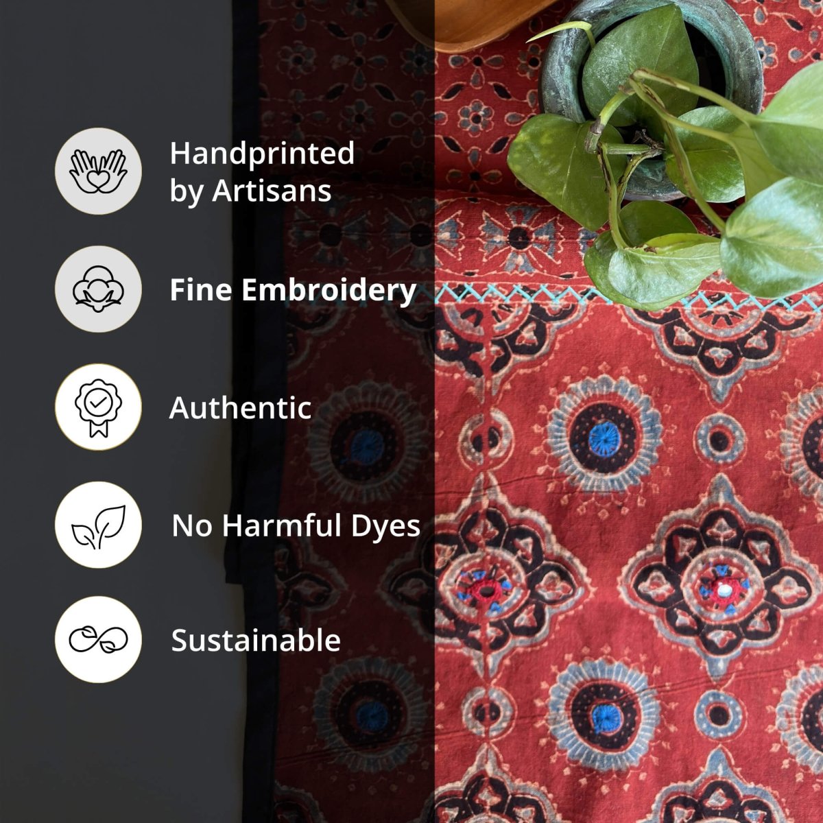 This striking table runner is a must-have for your home. An amalgamation of two craft forms-Ajrakh hand block printing and hand embroidery, it has rich earthy tones which are juxtaposed with geometric hand embroidery and glistening mirrors.