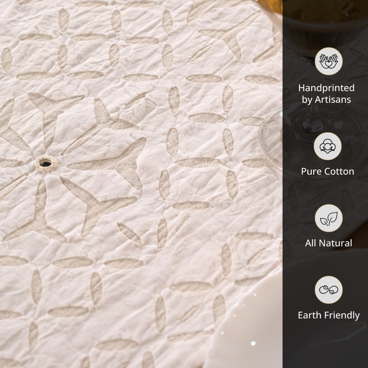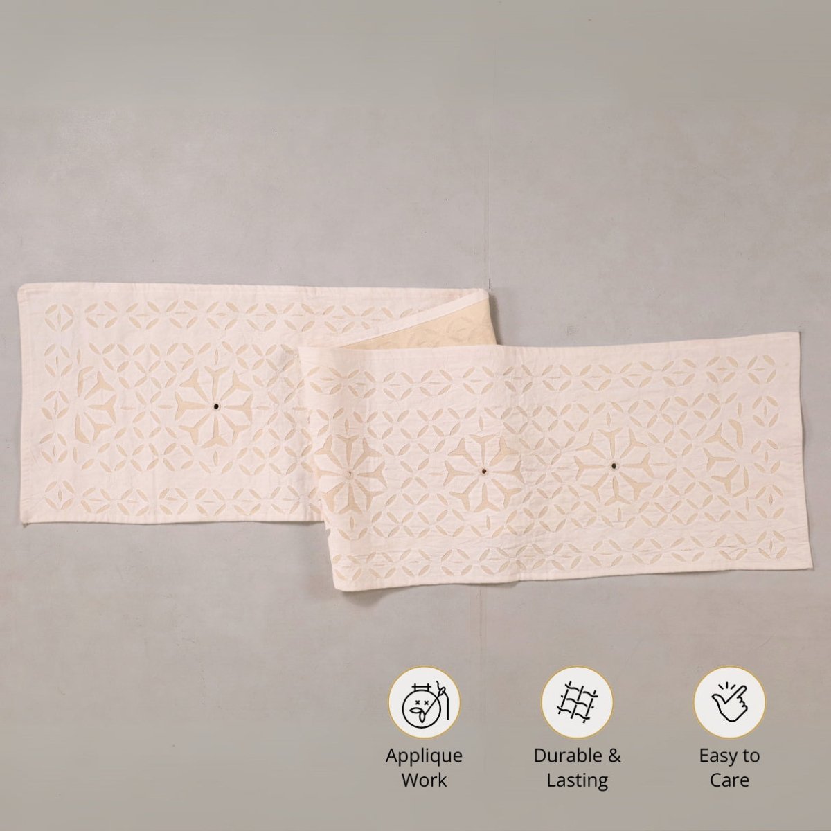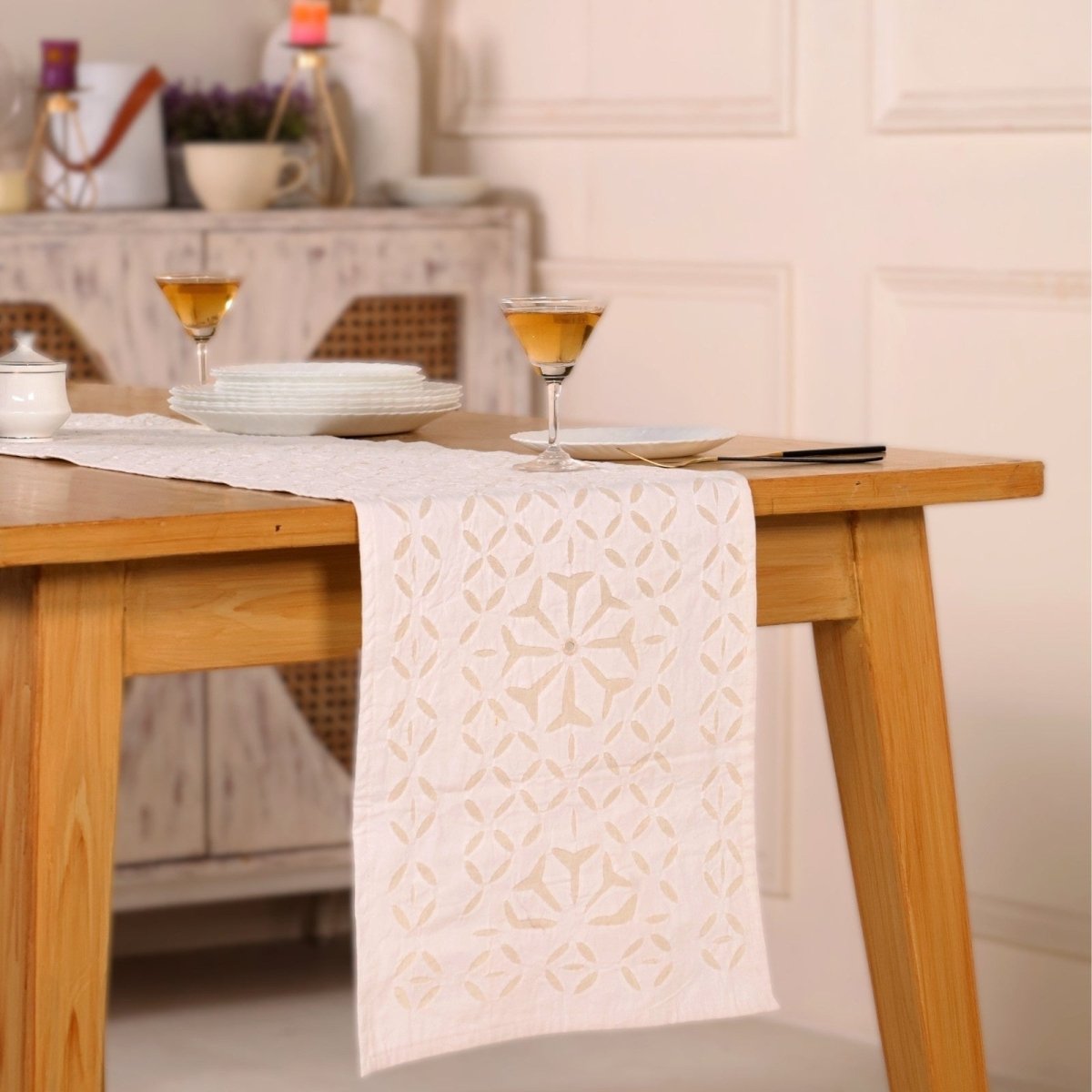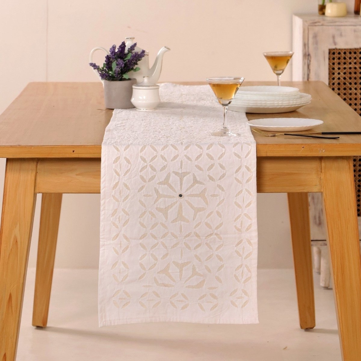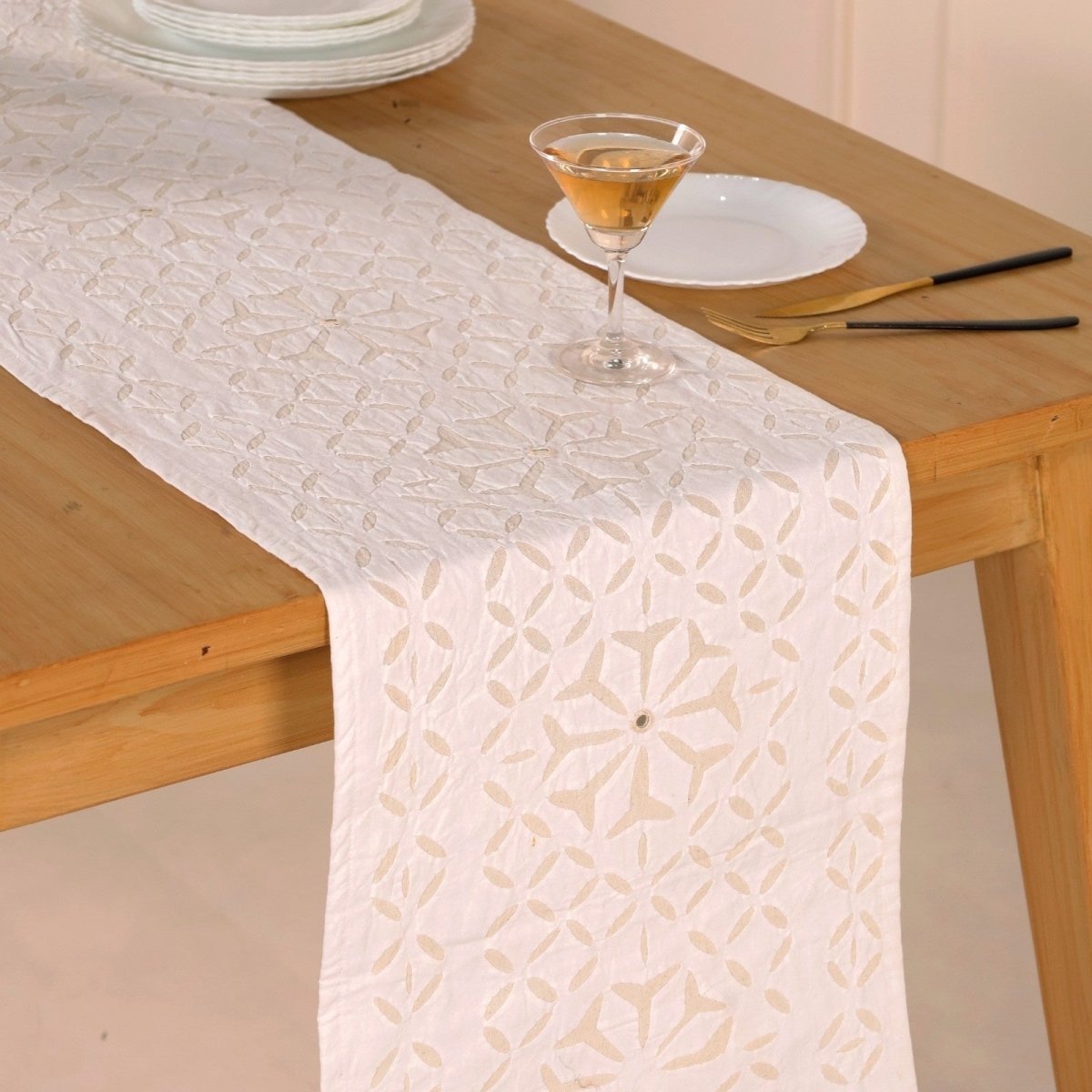 Dining Table Runner In Lily White Applique Cutwork Cotton With Mirrors | Handmade In India