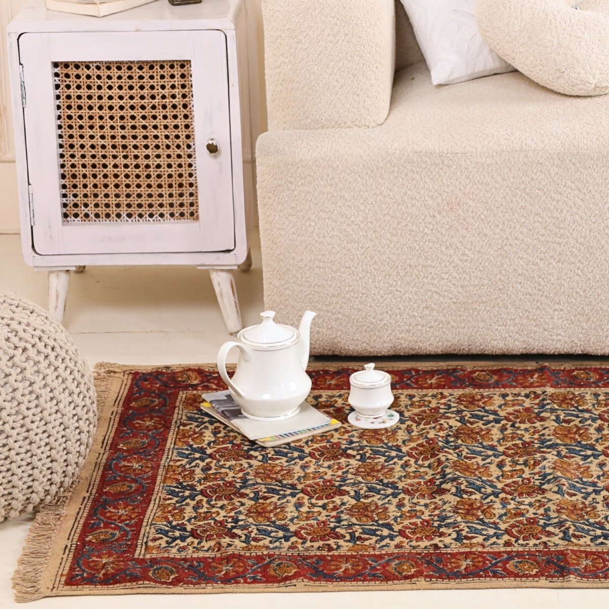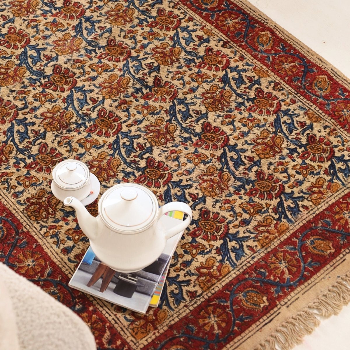 Handmade Cotton Rugs In Maroon, Blue, And Beige With A Floral Kalamkari Print | Handmade In India