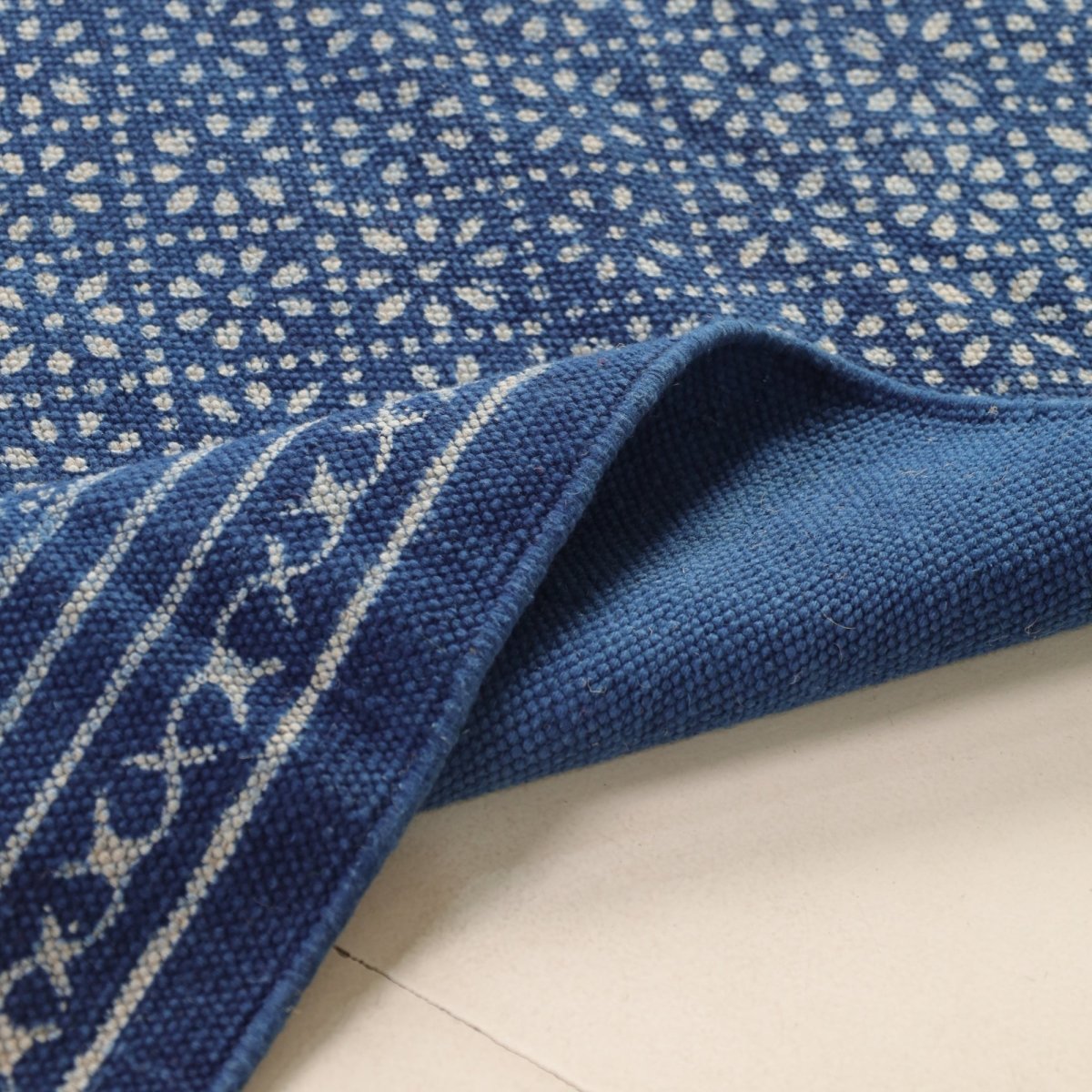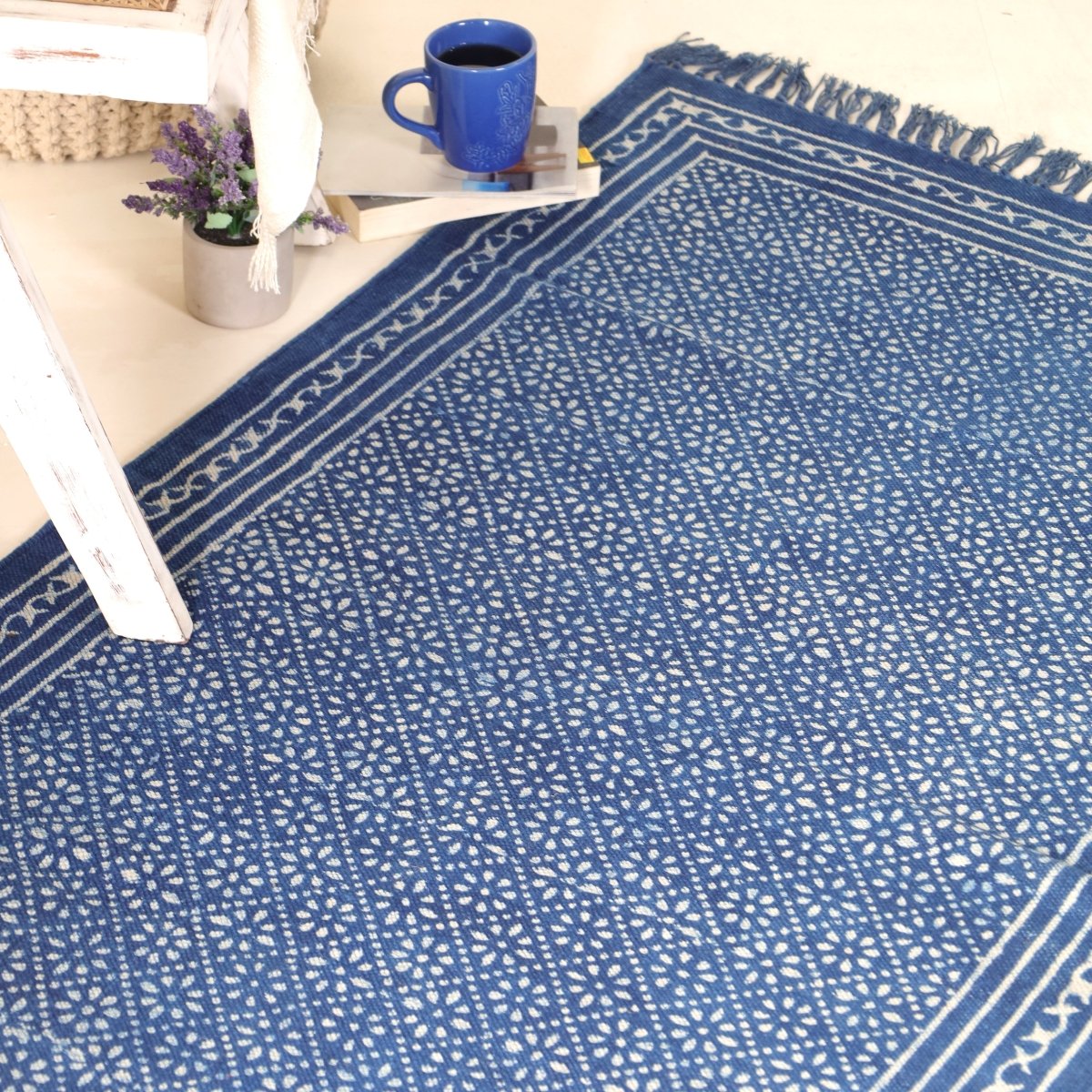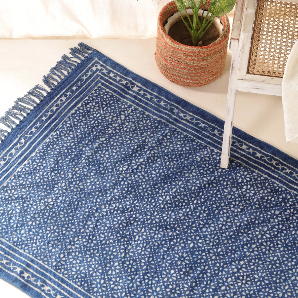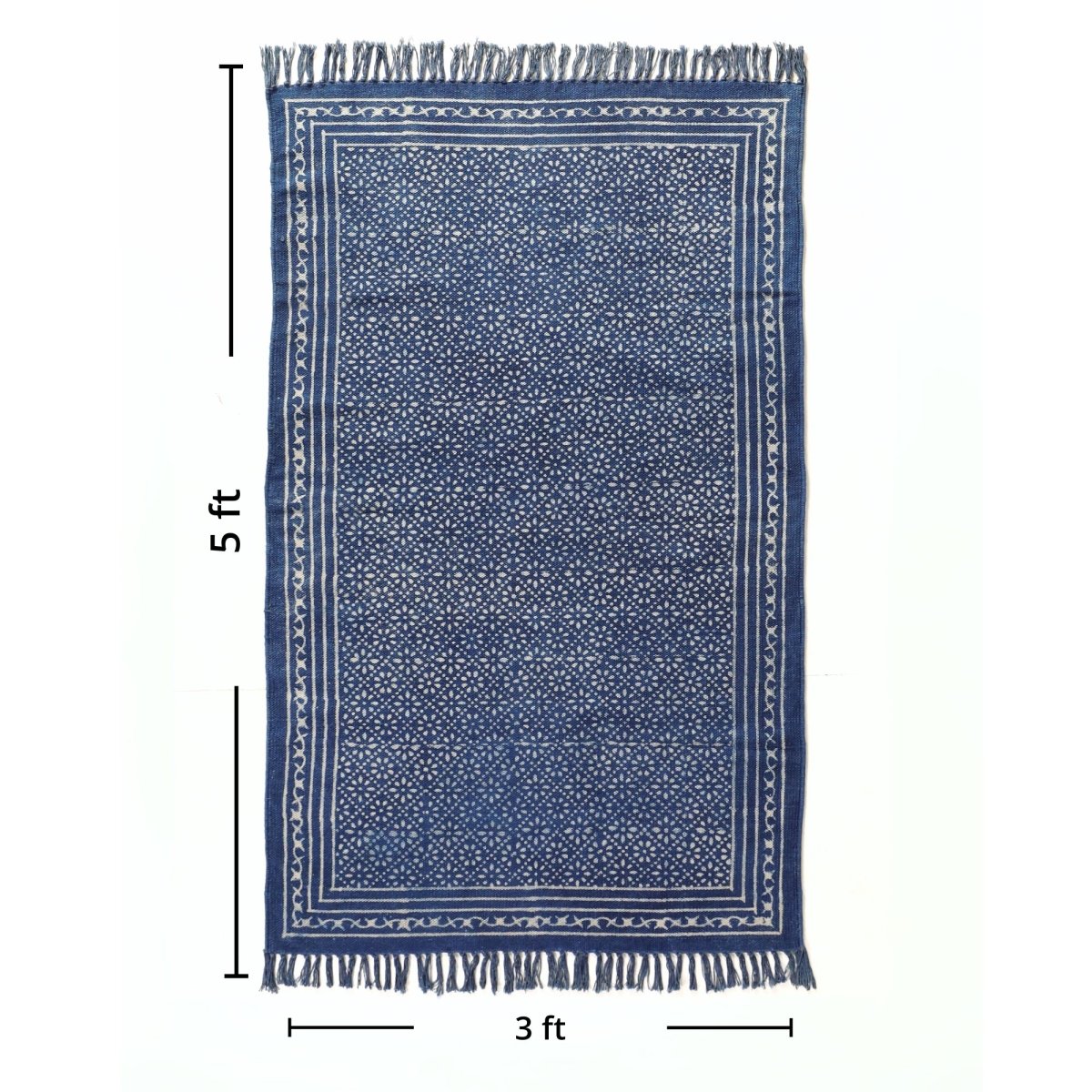 Bring home our stunning hand block printed Indigo cotton carpet, meticulously crafted to infuse your living space with artisanal charm. Its versatile geometric patterns effortlessly blend with your existing decor, making it a stylish addition to any room. Sized at 3 x 5ft, this cotton carpet is the perfect fit for your home decor needs.