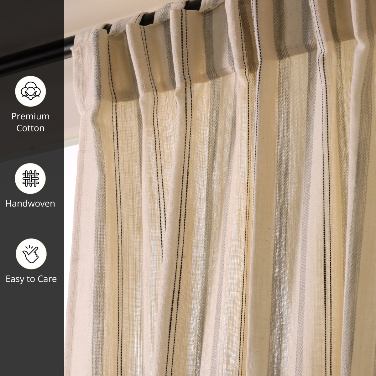 Off-White & Charcoal Handwoven Cotton Striped Curtain | 7 ft/9 ft Length