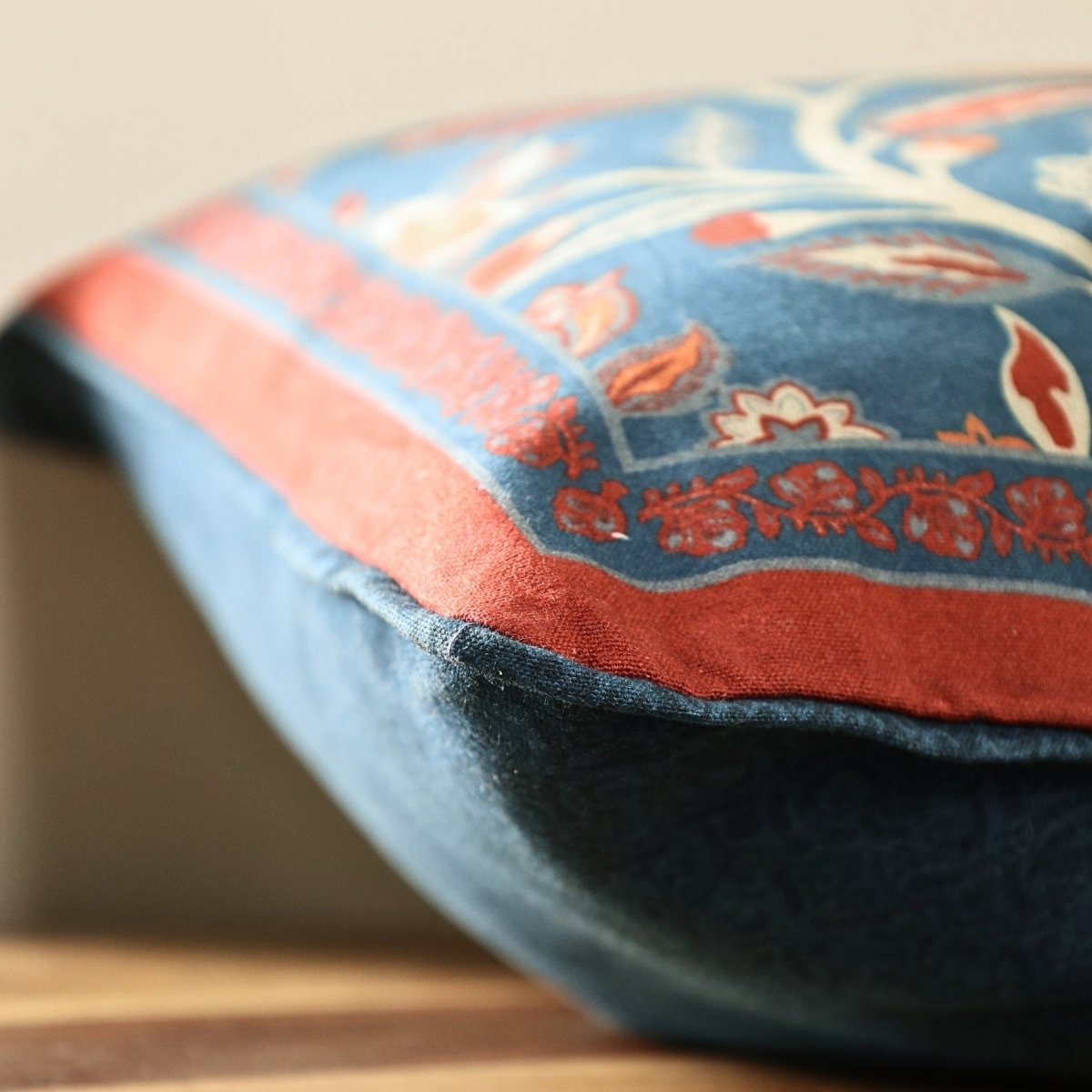 Inspired by the timeless elegance of vintage Chintz, this cushion cover in Navy, Maroon and Ivory adds a touch of old-world charm to your home. Featuring 18th-century floral patterns and hand-block prints created by skilled artisans, this piece seamlessly combines traditional craftsmanship with contemporary design.