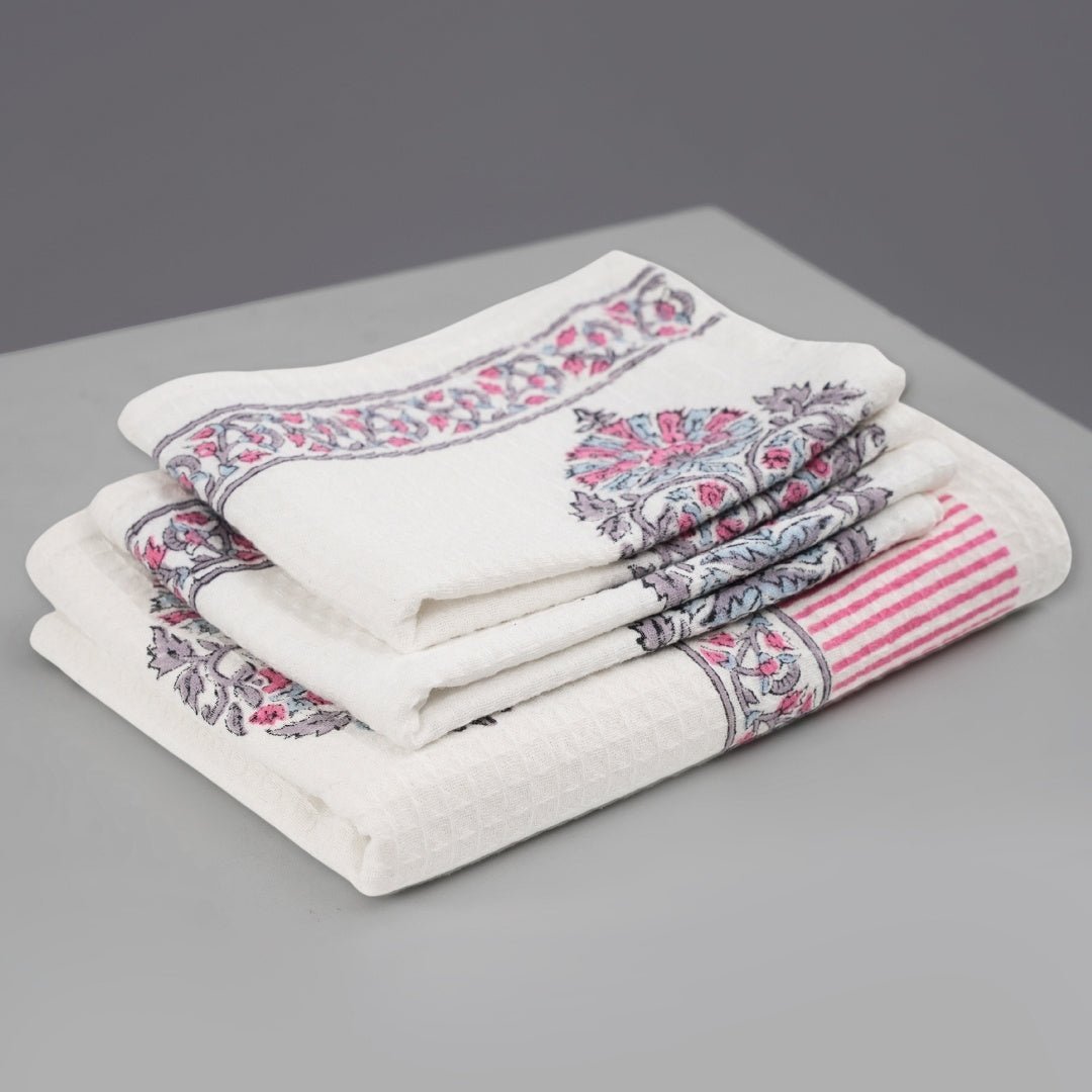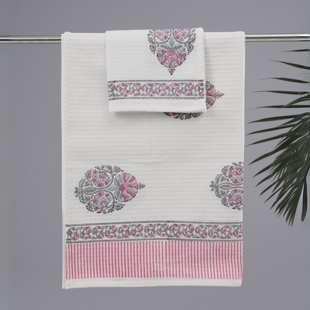 Make bath time a luxurious experience with our soft and plush range of beautifully hand printed cotton bath towels. The waffle weave of the fabric enhances its absorbency, effectively wicking away moisture from the body to keep you dry and comfortable. The luxurious texture of this bath towel and hand towel set feels cosy against the skin.