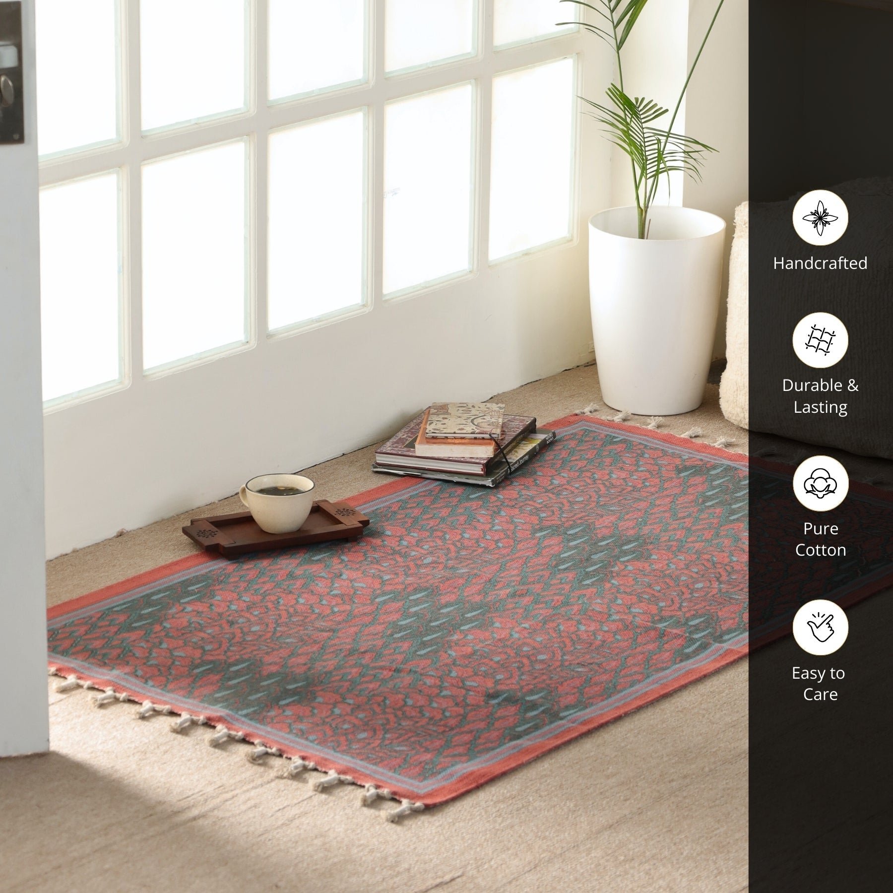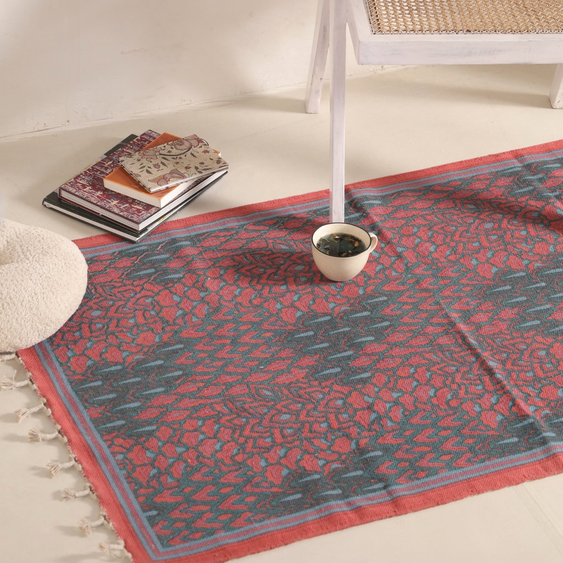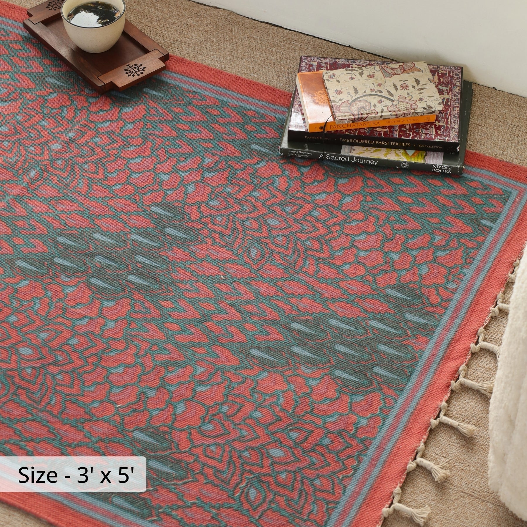 Pure Cotton Rug in size 3X5ft in Coral and Teal | Ideal for Living Room or Bedroom | Dry Clean only | Chintz Collection