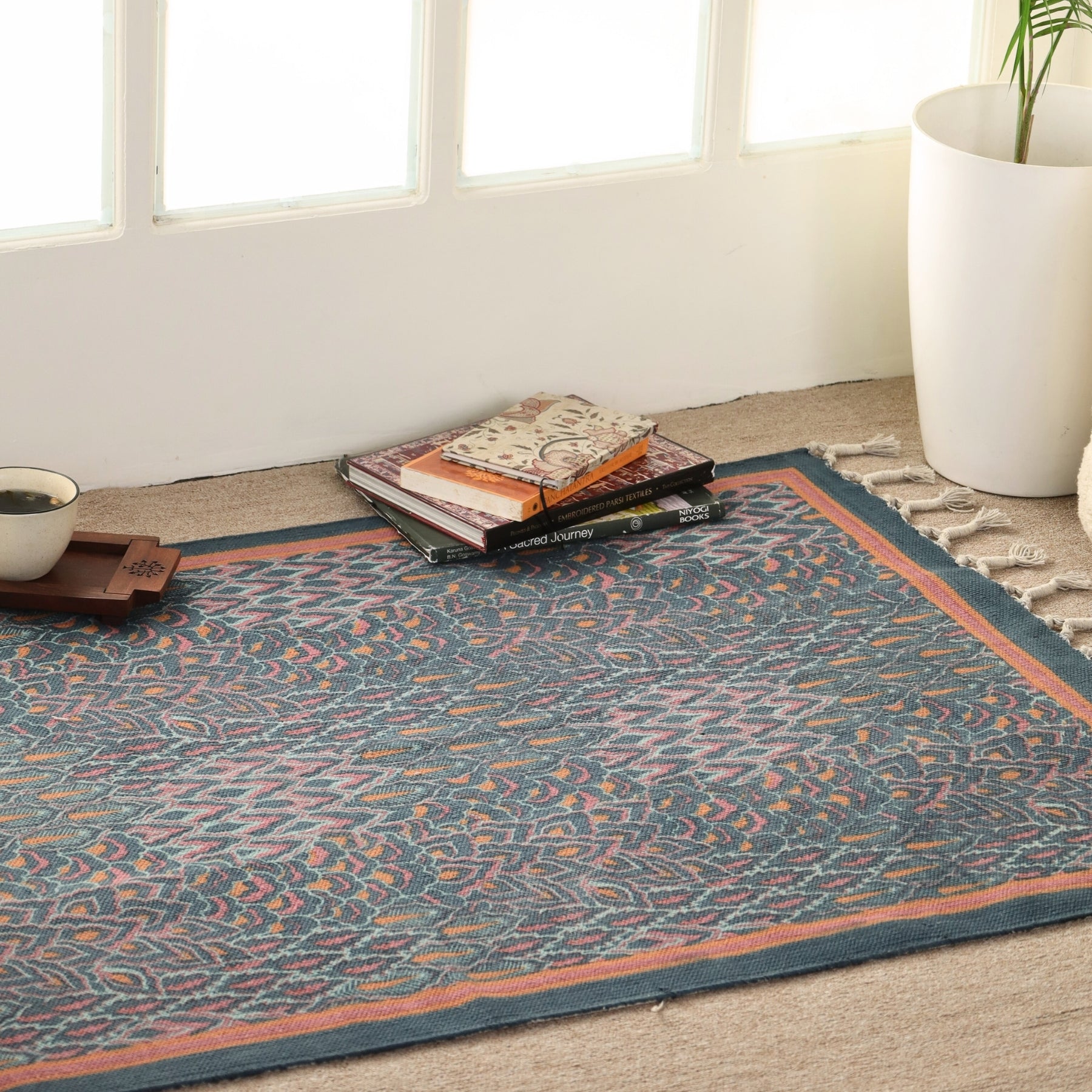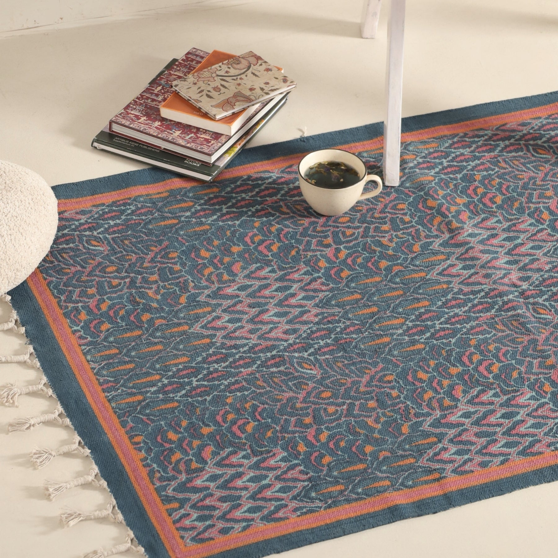 Pure Cotton Rug in size 3X5ft in Navy| Coral and Powder Blue| Ideal for Living Room or Bedroom | Dry Clean only | Chintz Collection