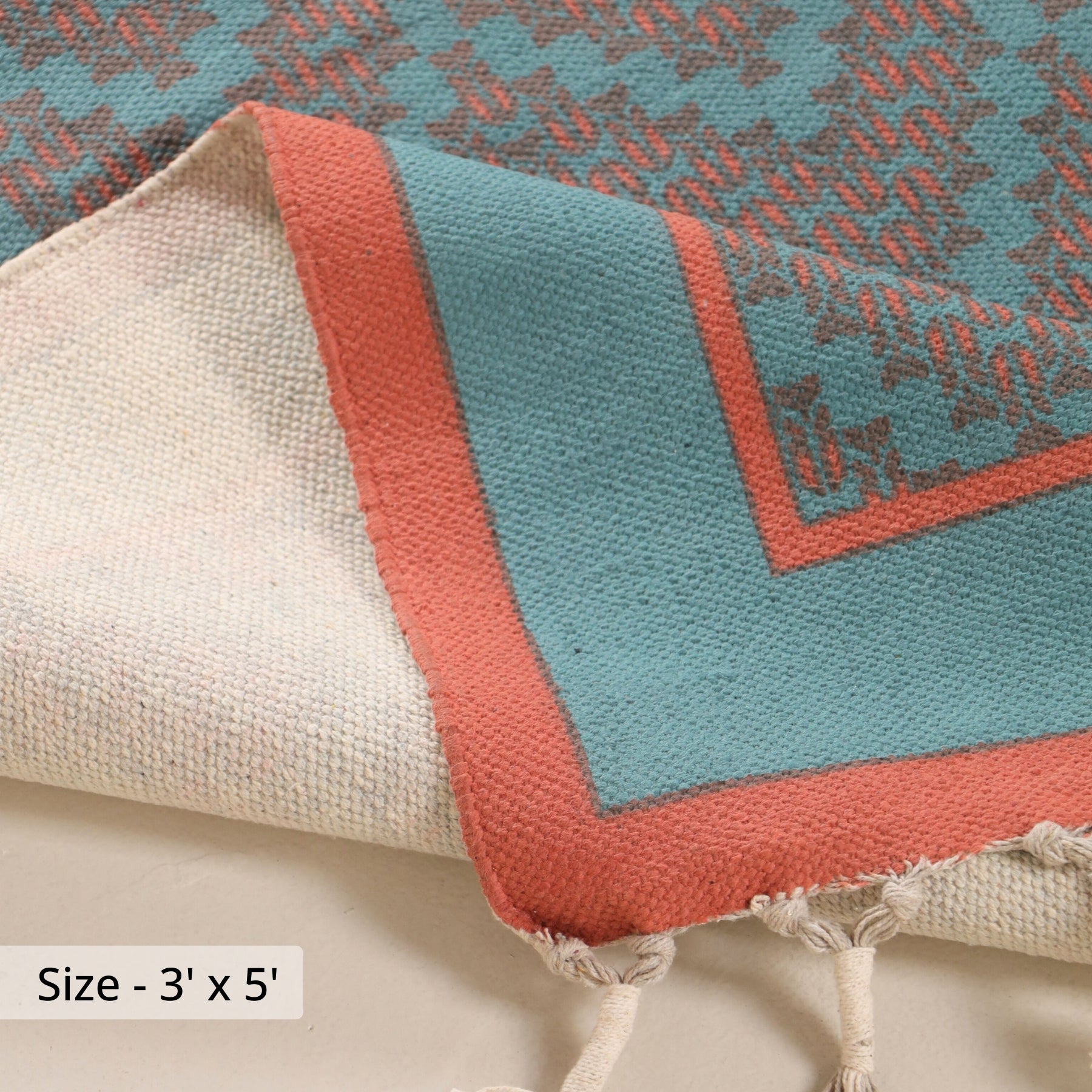 Pure Cotton Rug in size 3X5ft in Teal and Coral | Ideal for Living Room and Bedroom | Dry Clean only | Chintz Collection