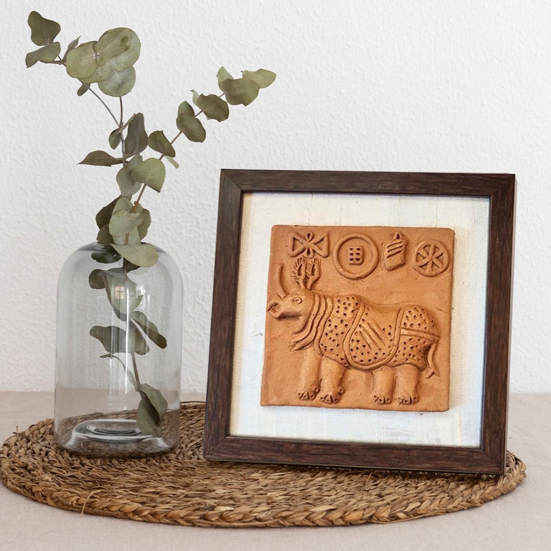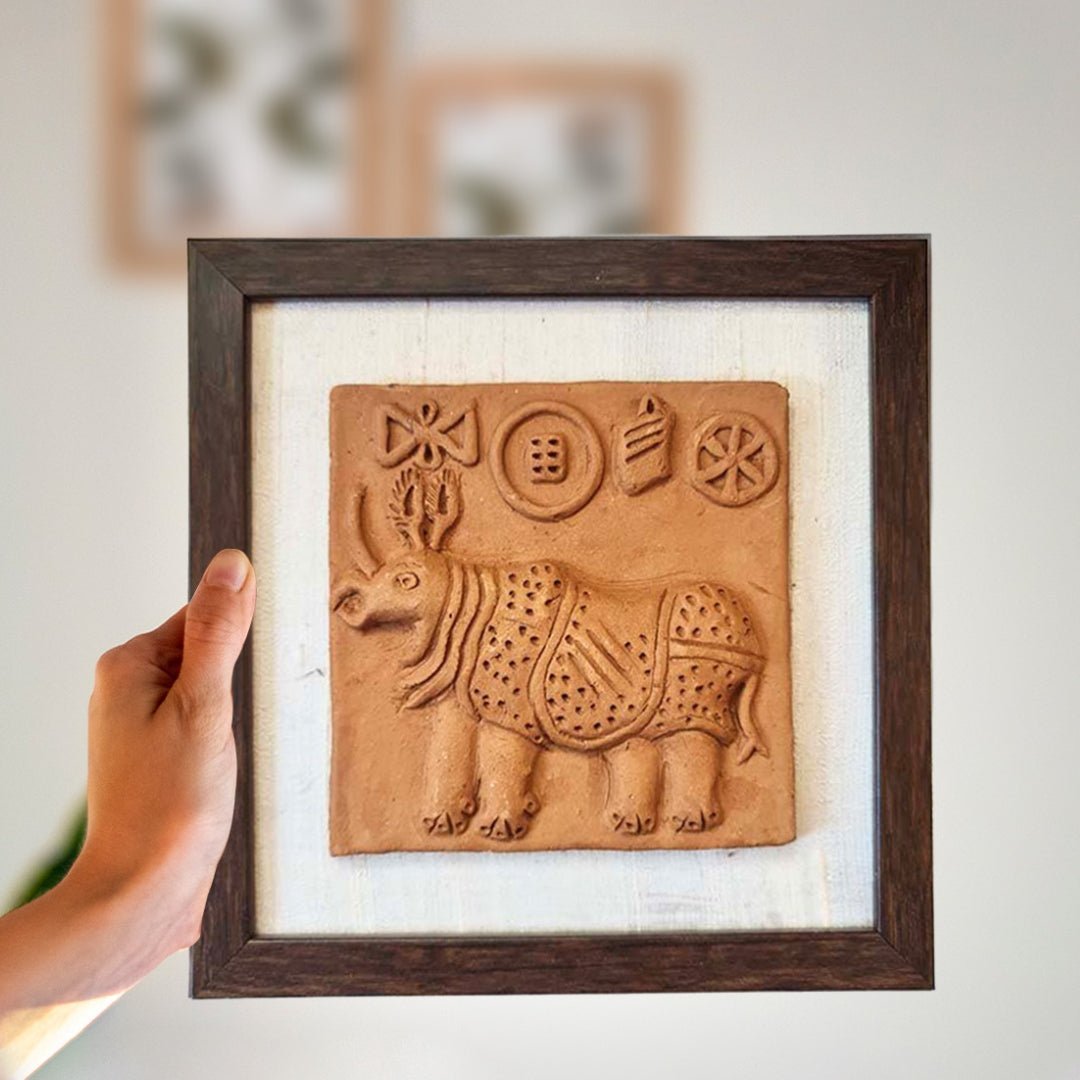 Terracotta Harappan Rhinoceros Seal Replica With Frame |Handmade In India | Wall Decor | Gift