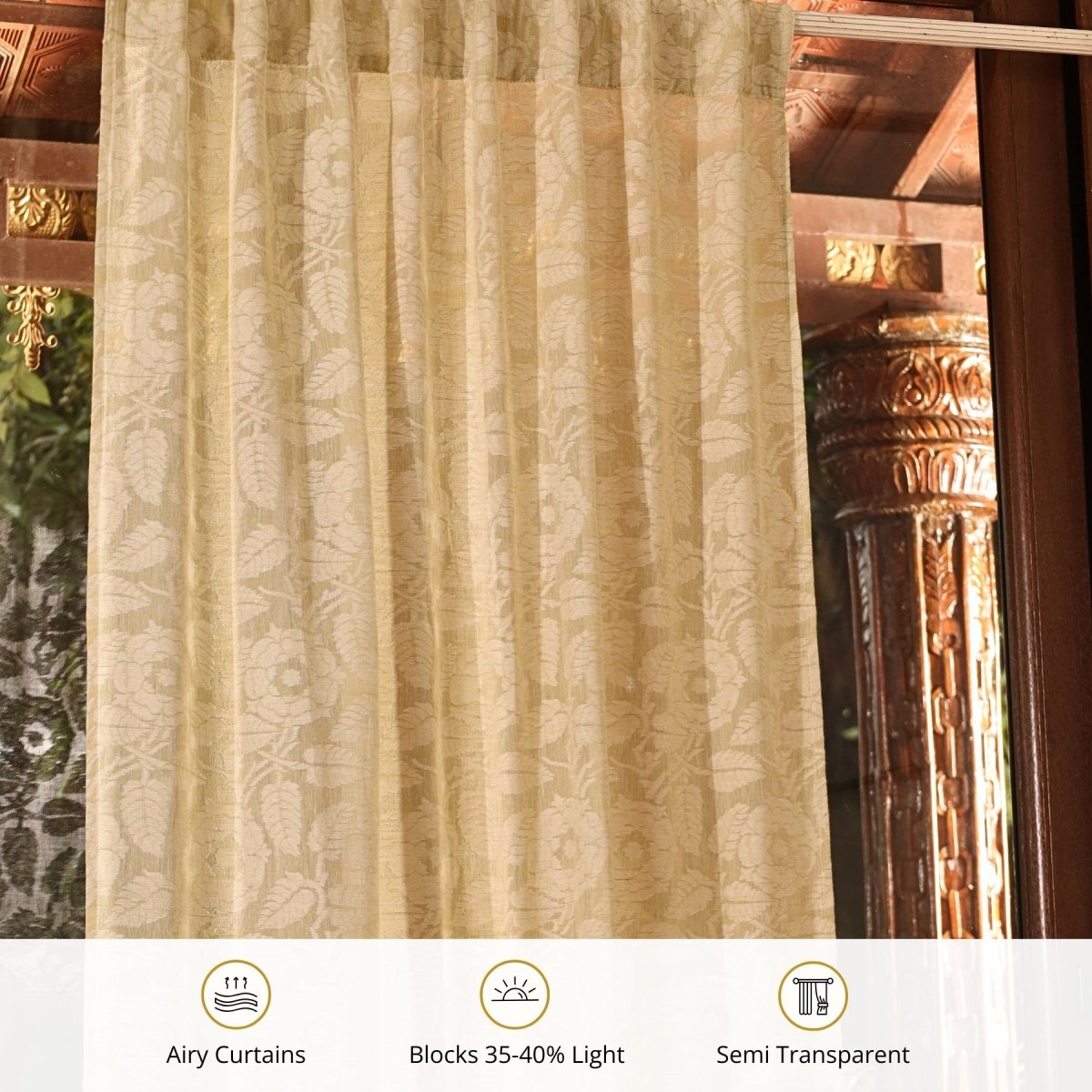 Discover a beautiful interplay of light and craftsmanship with these semi-sheer Cotton Door Curtains, handwoven in Banaras using the intricate missing weave technique. Inspired by the labor-intensive Karhuwa method, the floating threads are clipped, creating a stunning cutwork effect that allows soft light to filter through. These premium semi-transparent curtains offer a delicate balance of privacy and elegance.