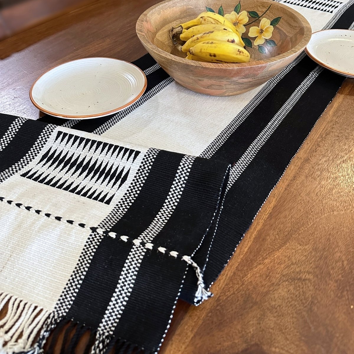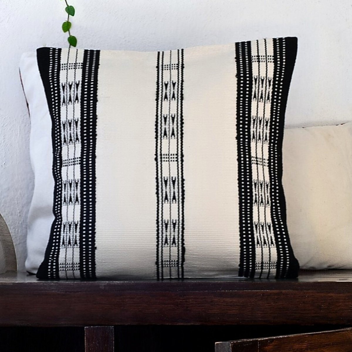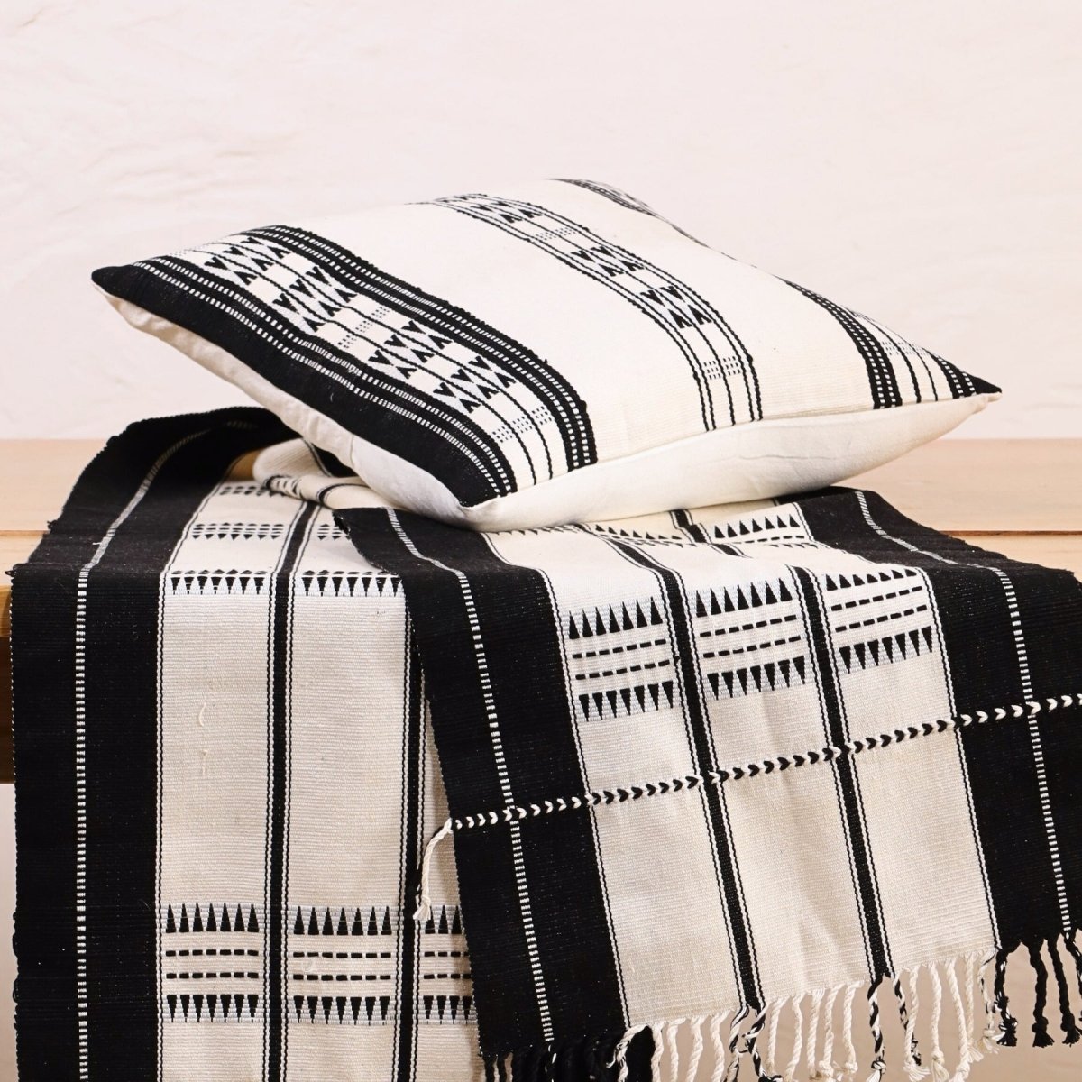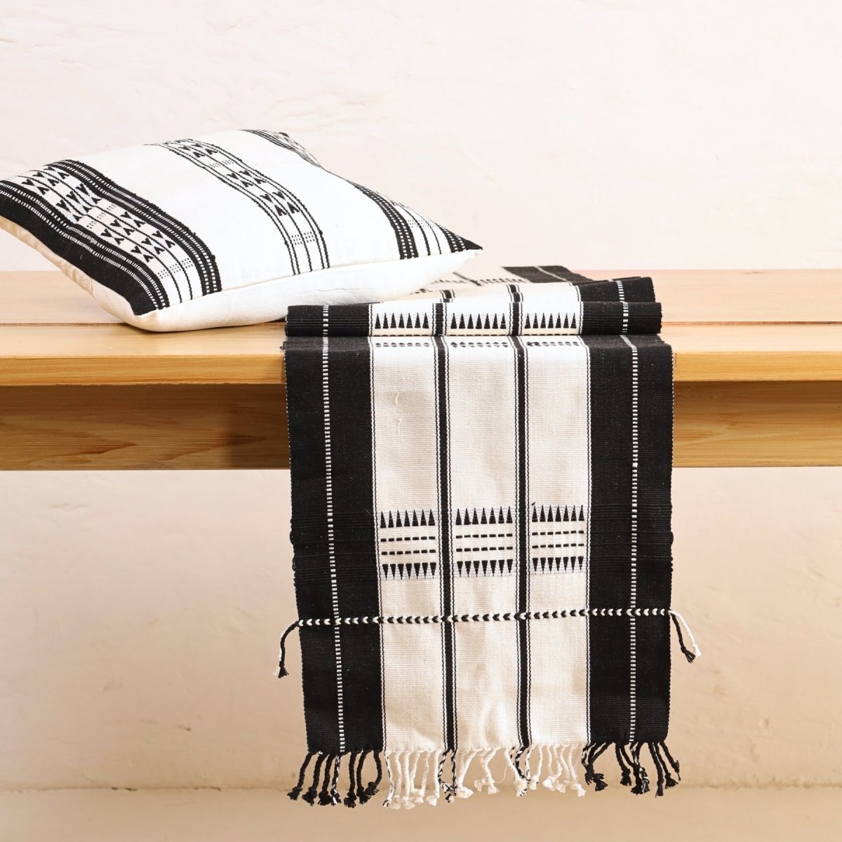 This set comprising of a striking black and white handwoven cushion cover paired with a handwoven table runner is the perfect, unique home decor gift for Raksha Bandhan.